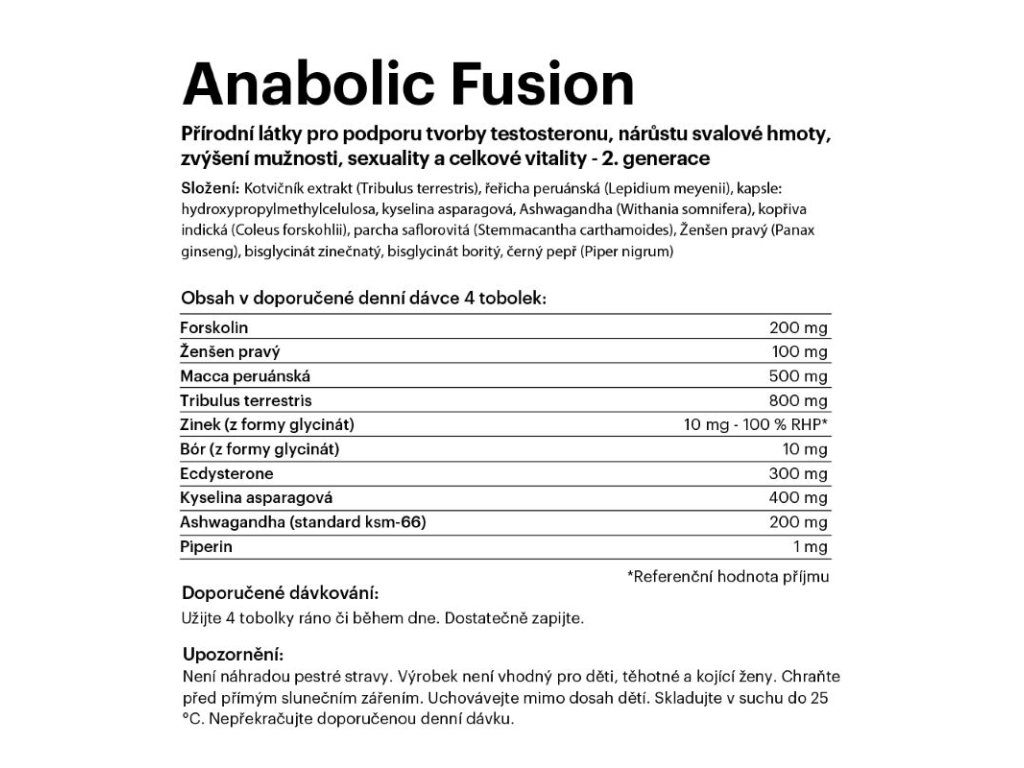 Vyvinuli jsme směs přírodních látek, které vzájemně synergicky působí na zvýšení testosteronu u mužů. Anabolic Fusion podpoří výkonnost, sexualitu i vitalitu muže. Příznivě ovlivňuje celkovou hormonální rovnováhu. Maca peruánská je adaptogen, který pomáhá při únavě, výkyvech nálad a stresu. Sibiřský ženšen zase pomůže s vytrvalostí a regenerací. A v neposlední řadě Tribulus teresris zlepšuje svalovou hmotu a sílu. Dostaňte se do své optimální síly. Balení obsahuje 120 tobolek.