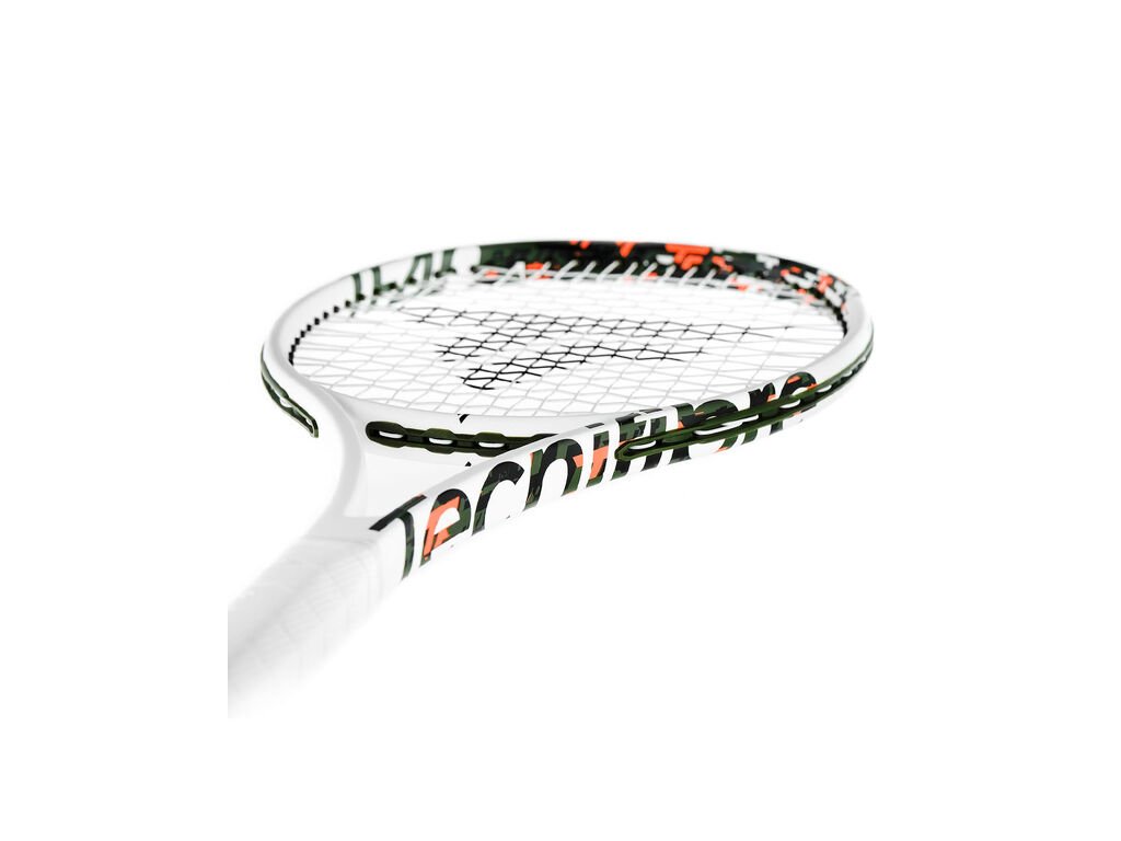 Raketa zaujme i svým moderním designem – bílý základ je doplněn o výrazné khaki a neonově oranžové prvky v dynamickém grafickém provedení.